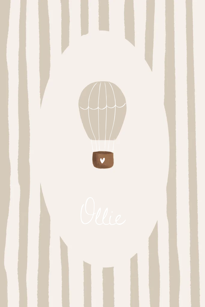Geboortekaartje met een hip en trendy streepjes patroon aan de rand met een aquarel handgetekende zon, luchtballon. De touwen van de luchtballon en de naam worden gedrukt in folie. Liever een dubbele kaart of een andere vorm kaart of heb je hulp nodig met opmaken? Stuur een berichtje, wij helpen je graag verder!