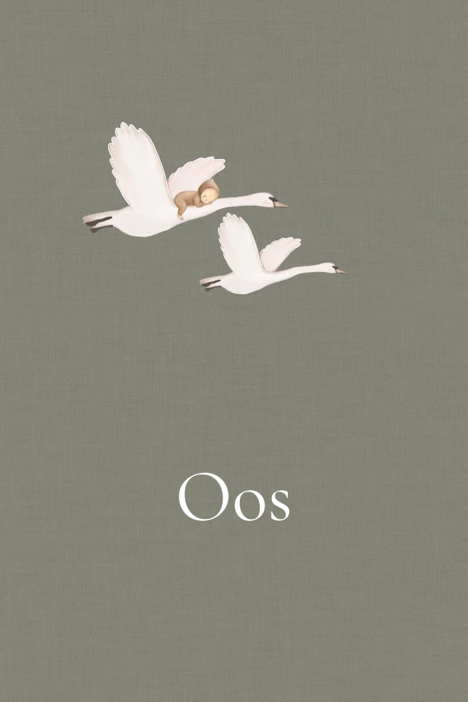Prachtig geboortekaartje met mooie aquarel zwanen en baby op de rug. De lijnen van de vleugels worden gedrukt in goudfolie voor het wouw-effect.