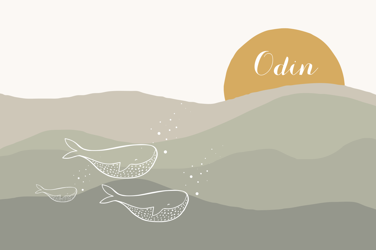 Geboortekaartje met walvissen in de golven van de zee in goudfolie. De omlijning van de walvissen en bubbeltjes water en de babynaam worden gedrukt in goudfolie.