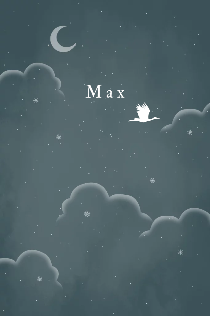 Mooi geboortekaartje met wolken, een ooievaar en sneeuw in goudfolie. Pas de kleur achtergrond gemakkelijk aan in de editor. Hulp nodig? Wij helpen je altijd graag!