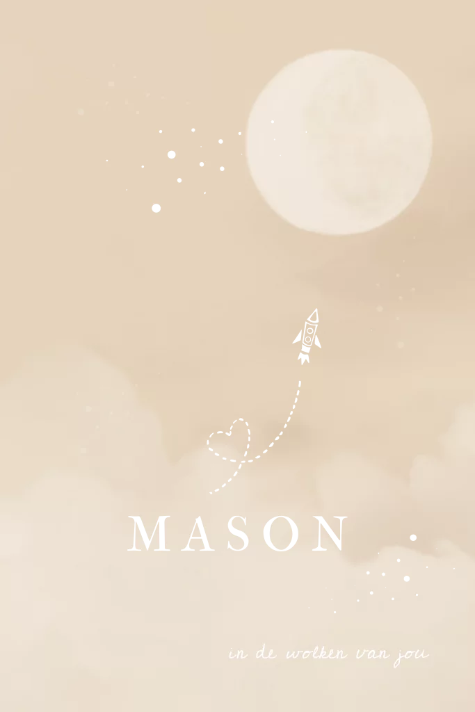 Geboortekaartje wolken beige maan raket vliegend hartvorm