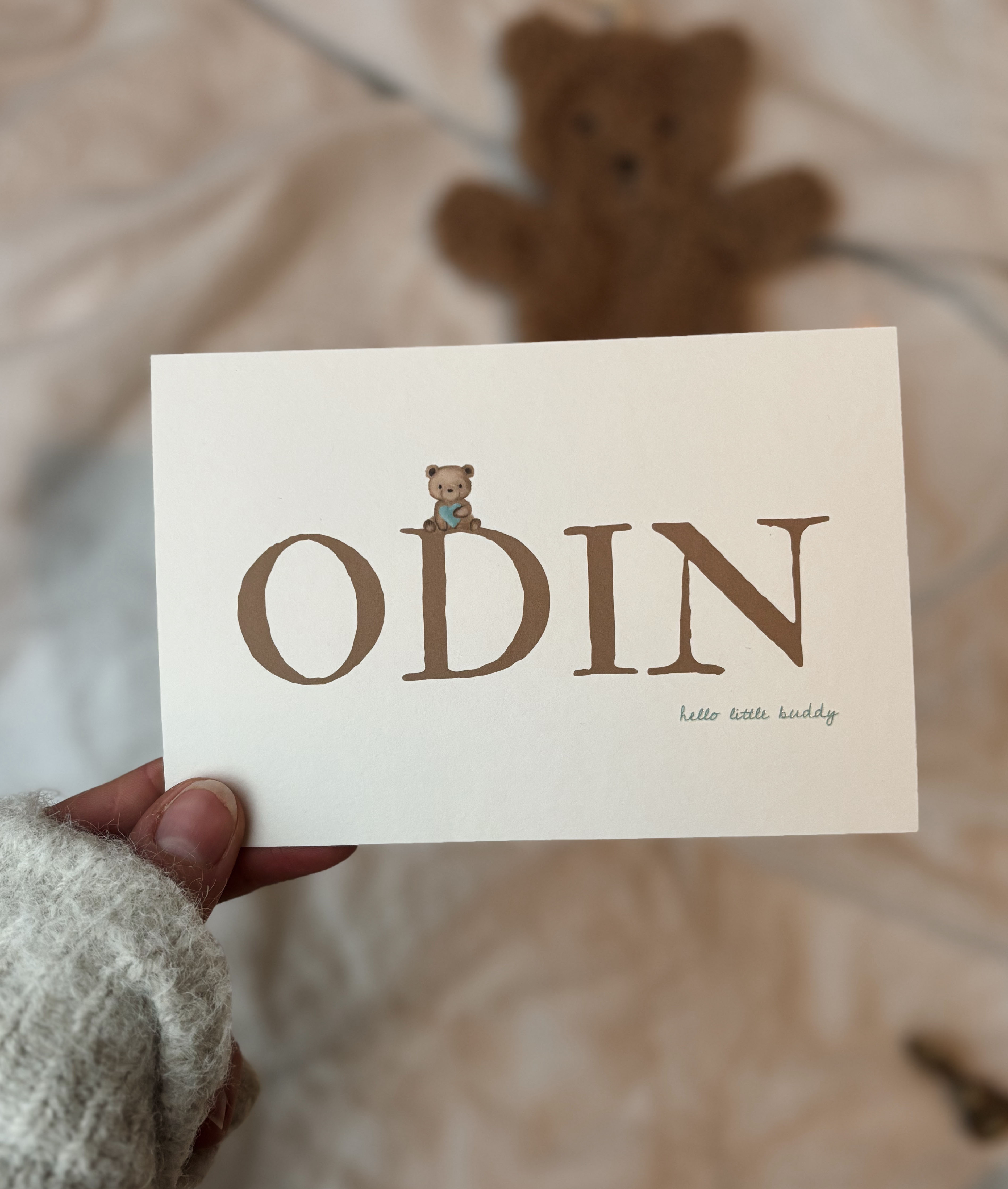 Stoer geboortekaartje met een lief handgetekende teddybeertje met (hogglans) hartje in zijn hand (die in gewenste kleur kan). Pas gemakkelijk de kleuren, achtergrond, naam en illustratie aan, net zoals al jouw gegevens op dit kaartje. Wil je deze kaart in een ander formaat/vorm of dubbele kaart? Stuur ons een berichtje en wij helpen je graag verder!