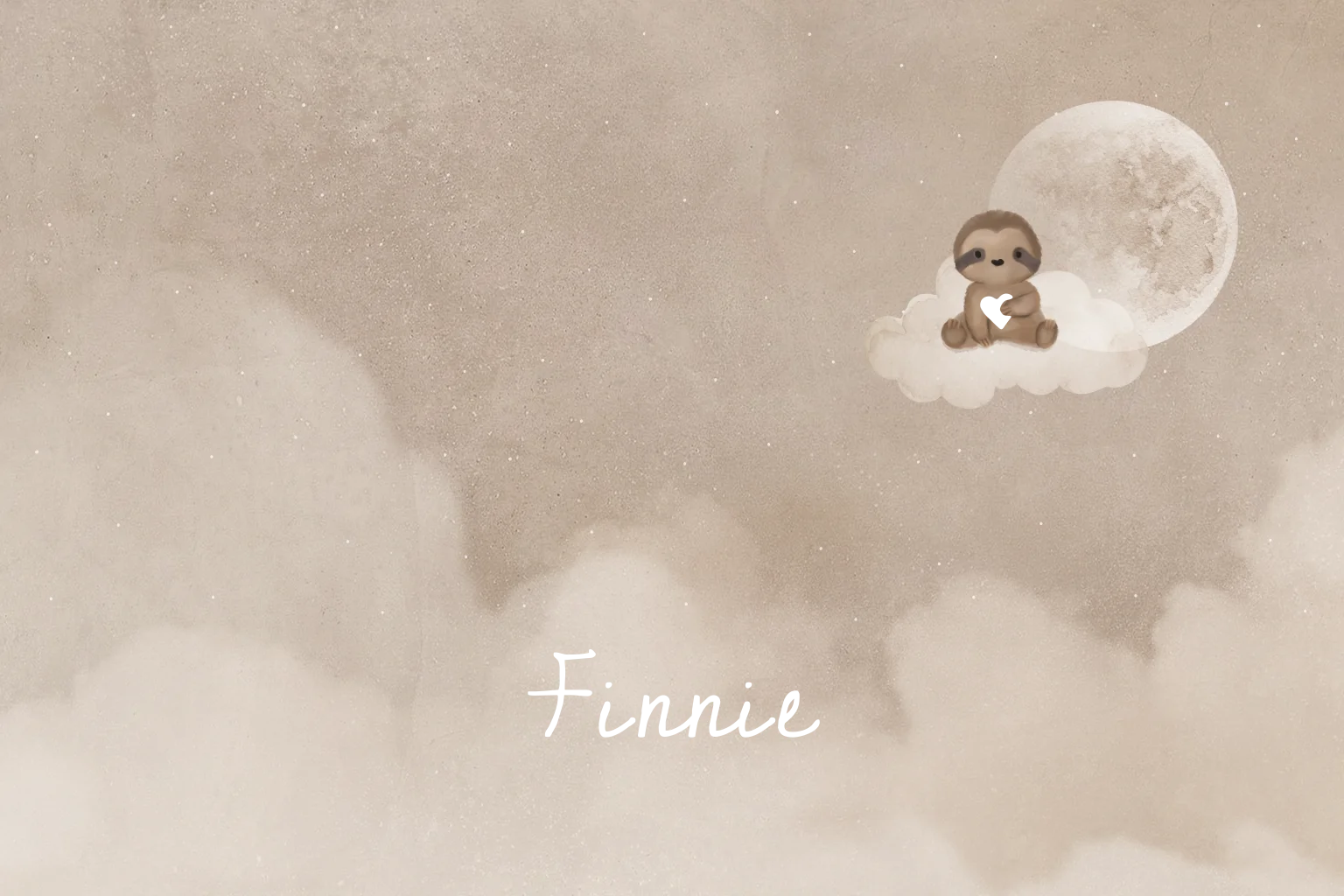 Neutraal geboortekaartje luiaard maan wolken hartje goudfolie