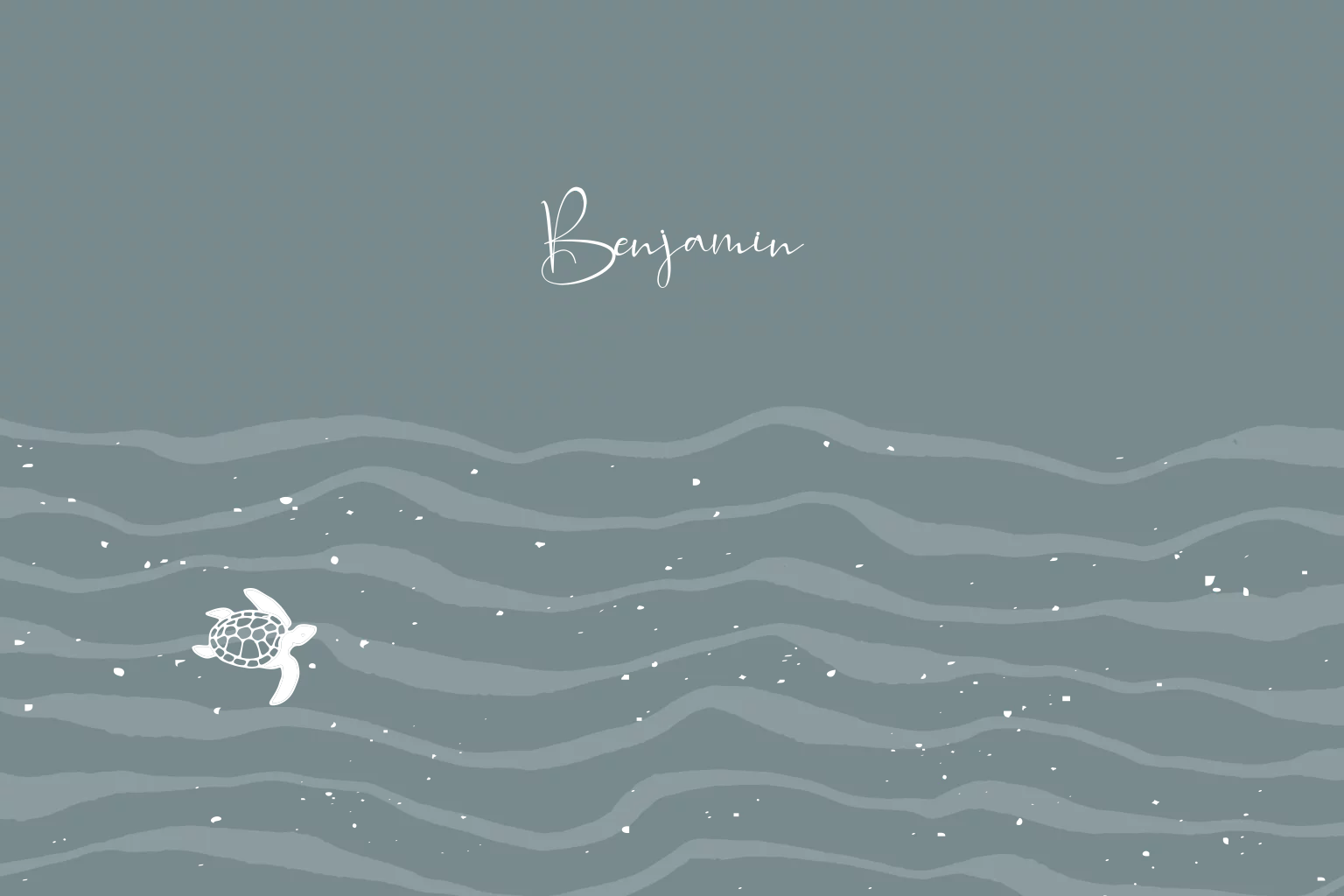 Een stoer geboortekaartje met een zwemmend schildpadje in de zee. Doordat er kleine deatils in het water in goudfolie worden gedrukt lijkt het net of er een glinstering in de zee zit, voor een echt wouw effect.