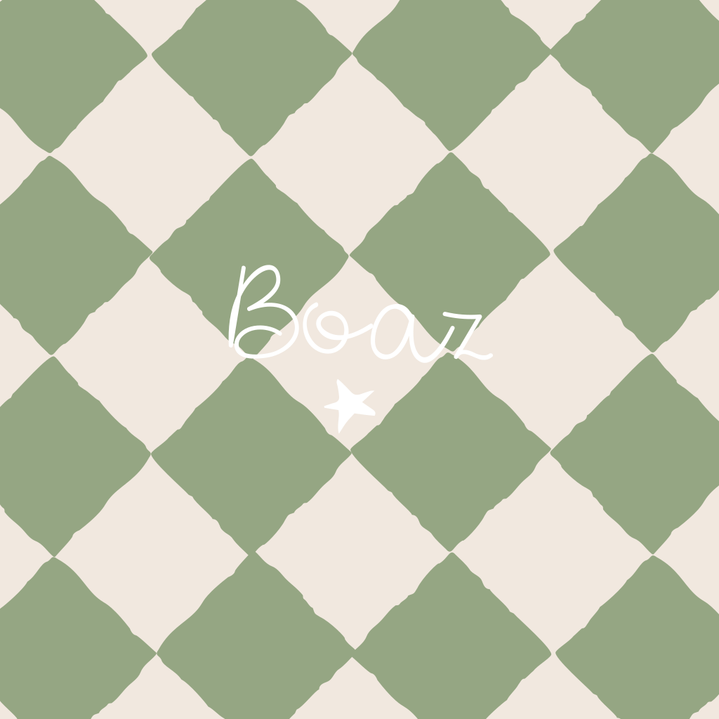 Trendy geboortekaartje met ruiten speels patroon in groen en beige. De babynaam en het sterretje eronder worden gedrukt in goudfolie.