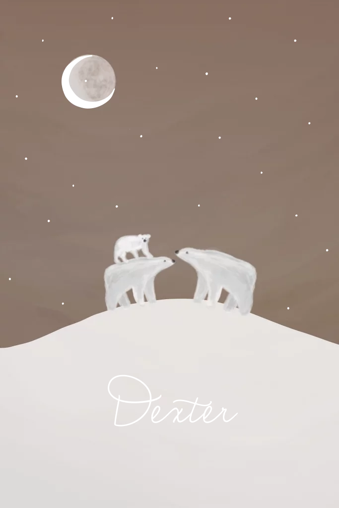 Winters geboortekaartje met ijsberen familie in de sneeuw. De maan, de subtiele stipjes (sterren) en de babynaam worden gedrukt in goudfolie. Personaliseer het kaartje zelf naar smaak met de handige editor en pas bijvoorbeeld de kleuren en/of folie aan.