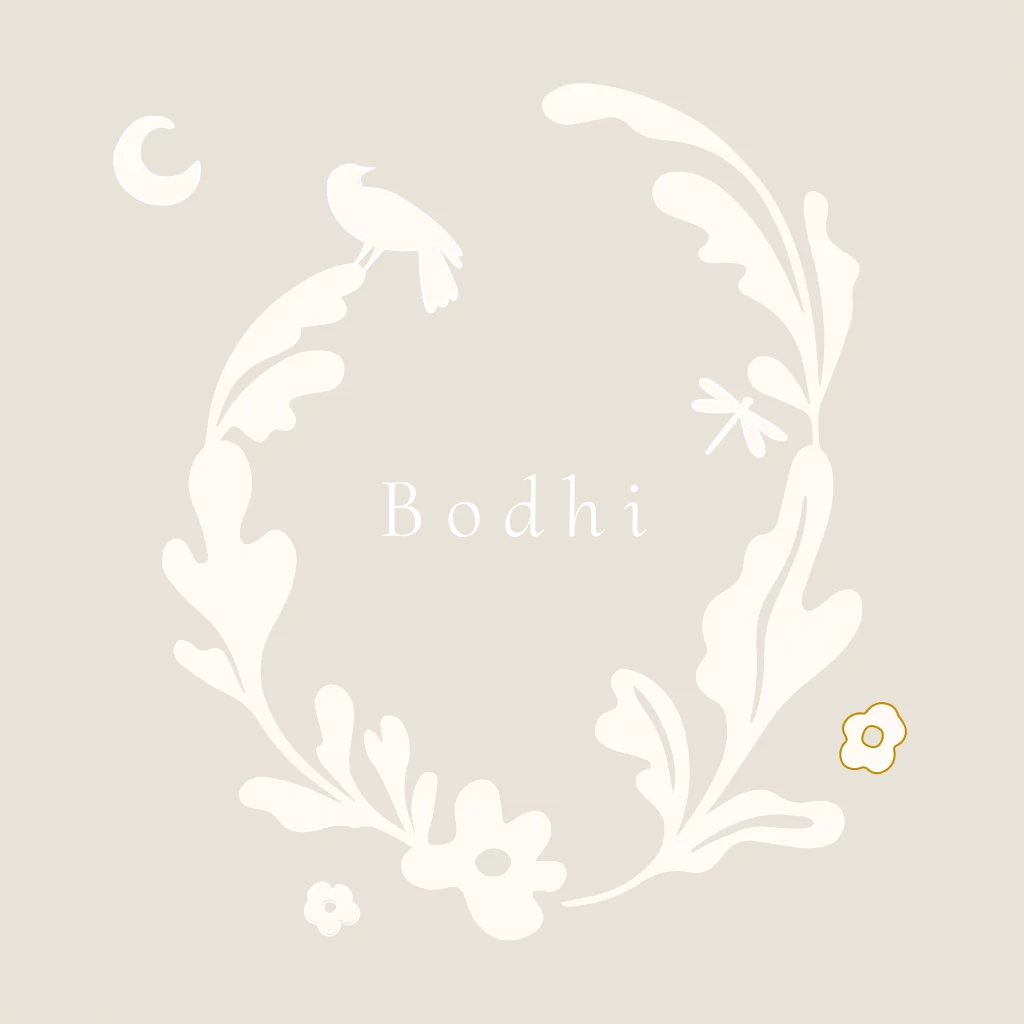 Vierkant geboortekaartje voor een meisje met handgetekende illustratie van een hippe bloemenkrans met vogel en maantje. De babynaam, maan, libelle en 1 bloem zijn gedrukt in goufolie.