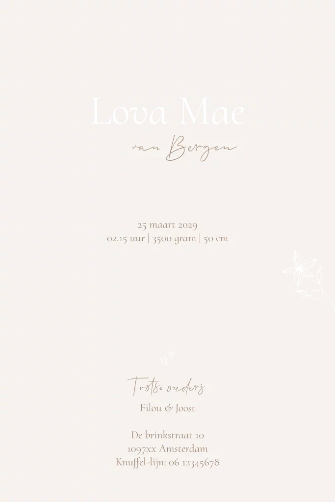 Prachtig openslaand meisjes geboortekaartje met handgetekende bloemen die rondom de maan getekend zijn in goudfolie. De achtergrond staat in beige, maar pas deze vooral aan aan jouw favoriete kleur of de kleur bijvoorbeeld van de babykamer. Heb je hulp nodig of heb je vragen, stuur een berichtje en wij helpen je graag!
