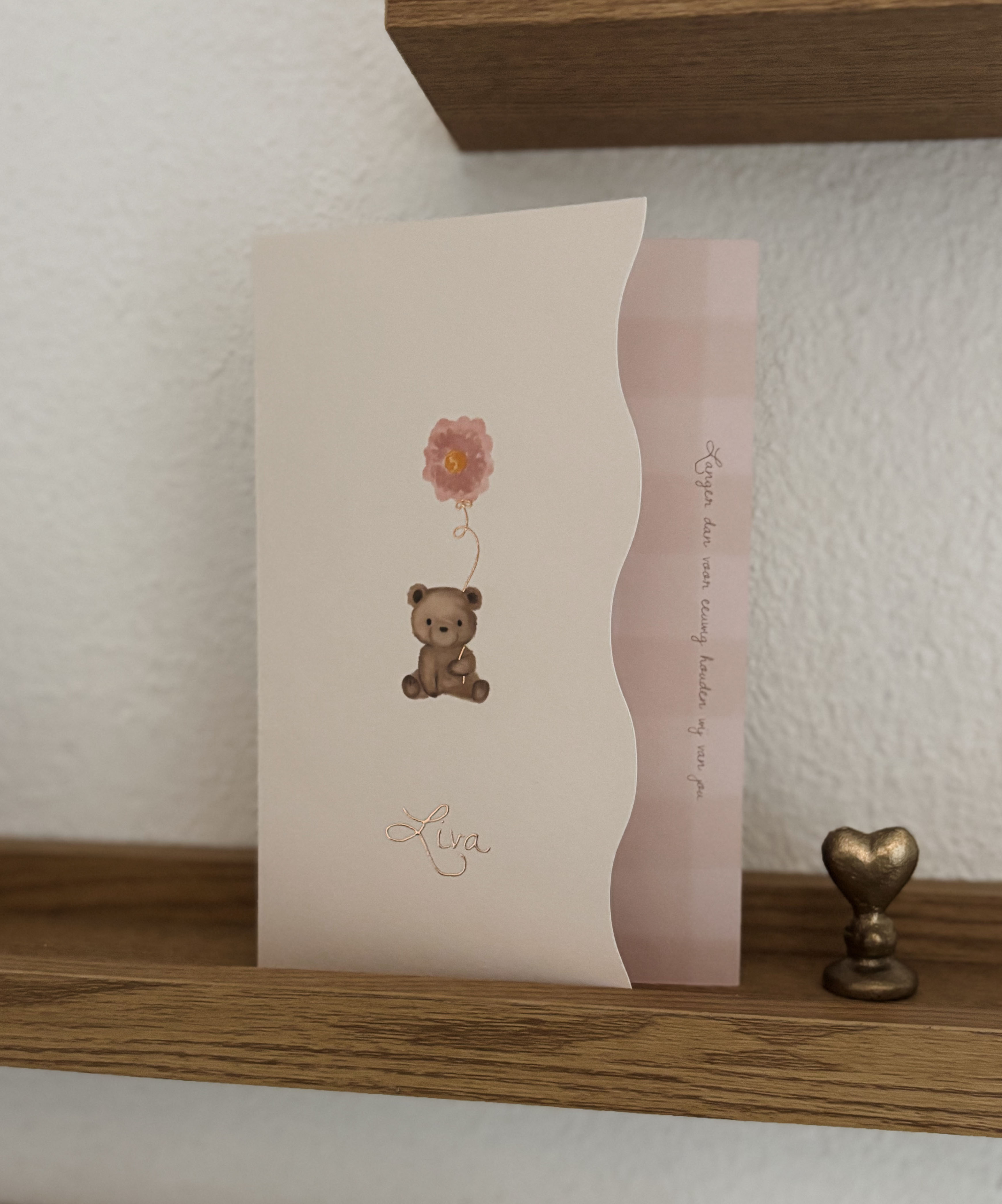 Stoer en lief geboortekaartje met een handgetekende aquarel teddybeertje met hartjesballon waarbij het touw van de ballon wordt gedrukt in folie. Tevens heeft en geboortekaartje een speciale golfvorm voor een gaaf effect! Hulp nodig? Stuur ons een berichtje, wij helpen je graag!