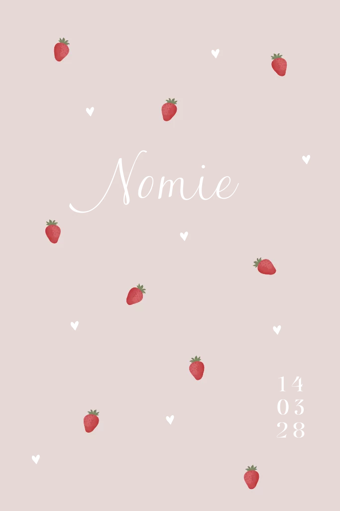 Lief fris geboortekaartje met kleine aquarel aardbeien. De babynaam en de datum worden gedrukt in goudfolie.