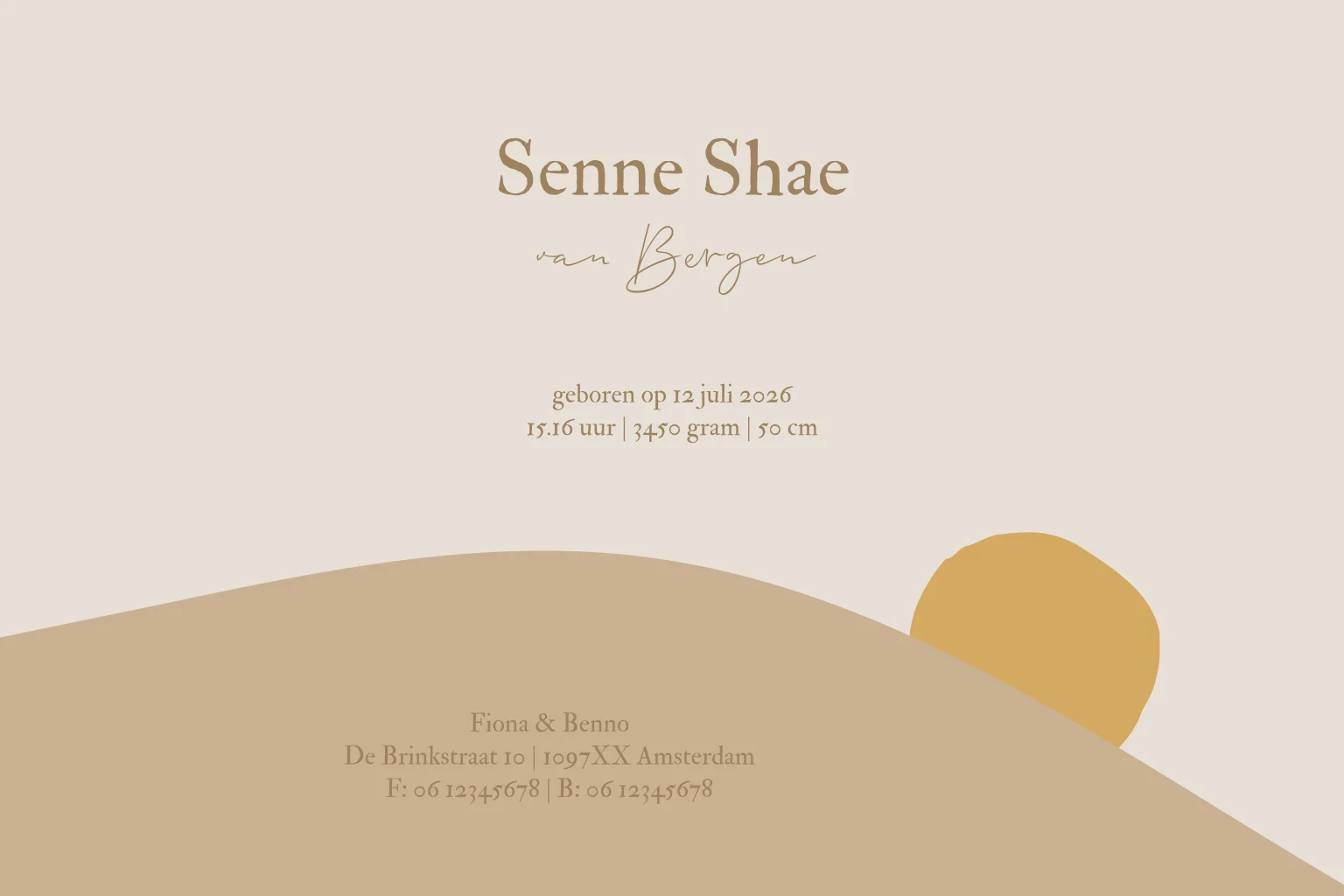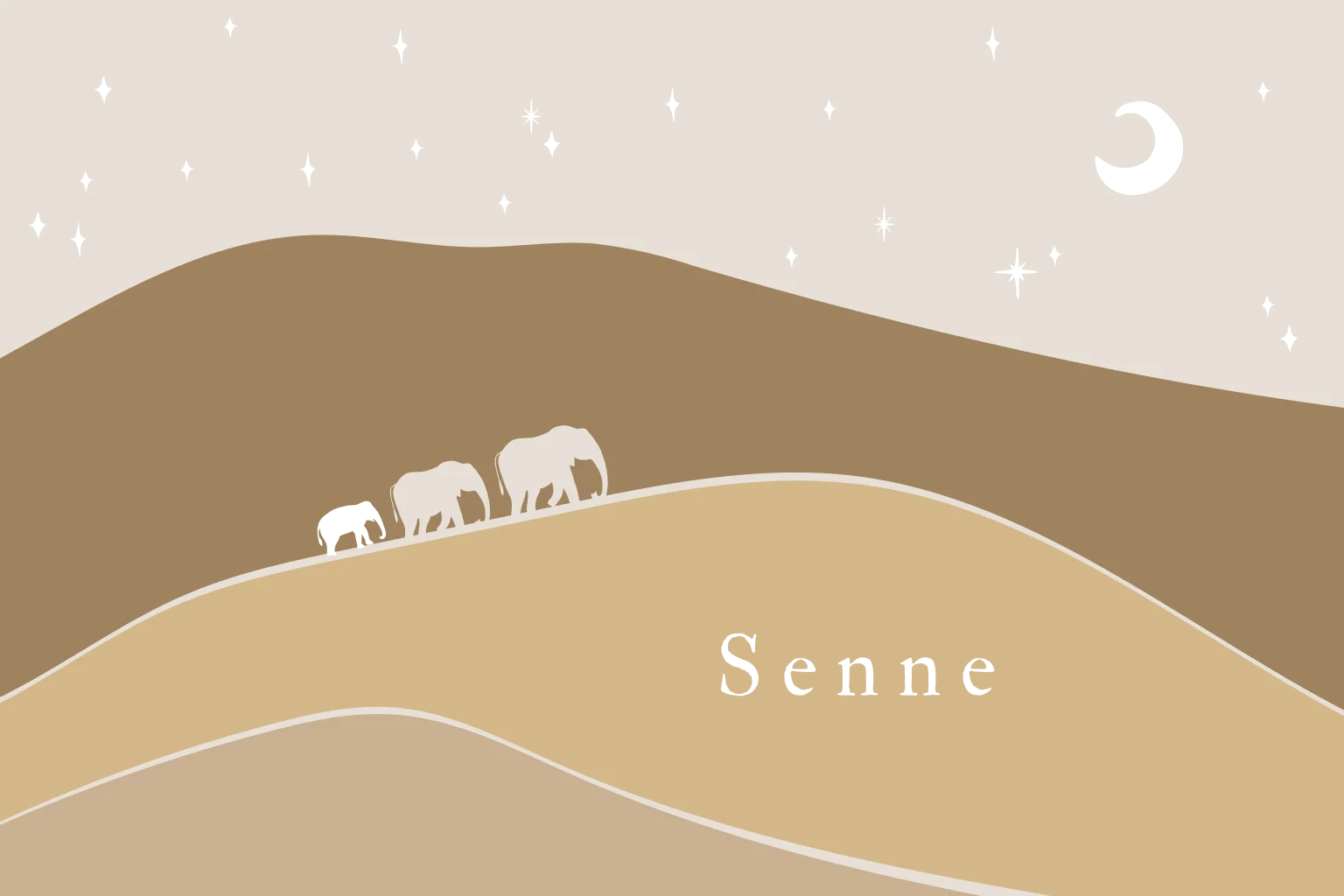 Een lief liggend geboortekaartje met een olifantenfamilie lopend in een landschap met maan en sterren. De maan, sterren, de kleine olifant en babynaam worden gedrukt in goudfolie.