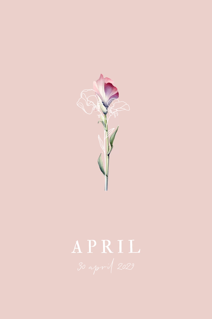 Geboortekaartje met een aquarel geboortebloem - maand april, de Lathyrus en een lijntekening van een Lathyrus eroverheen in rosegoudfolie. Hulp of advies nodig? Wij helpen je graag!