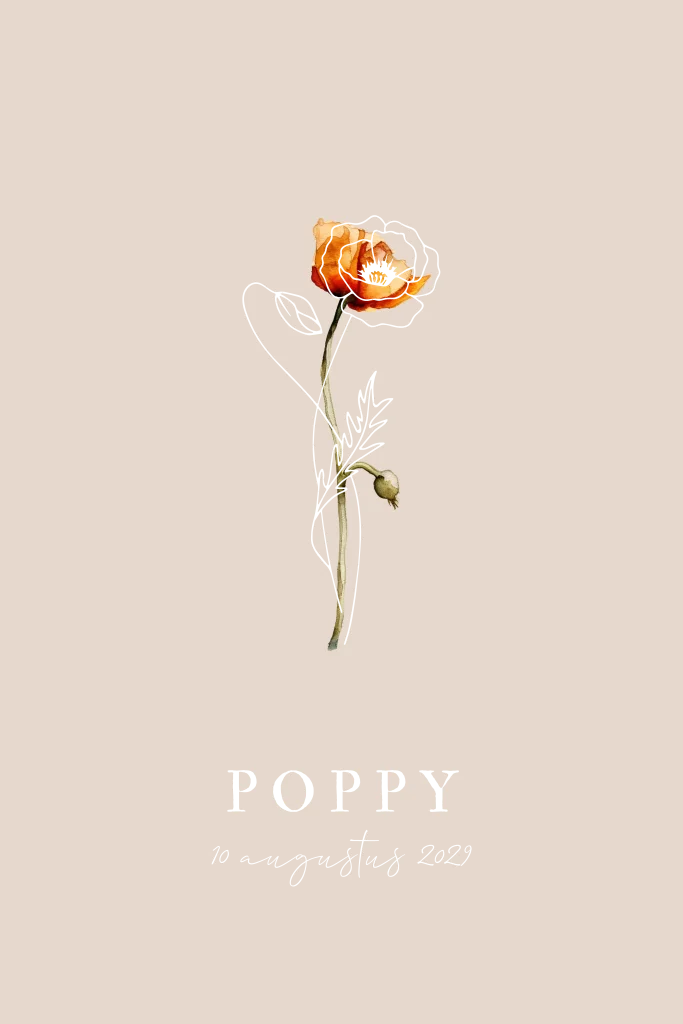 Geboortekaartje met een aquarel geboortebloem - maan augustus, de klaproos en een lijntekening van een klaproos eroverheen in koperfolie. Hulp of advies nodig? Wij helpen je graag!