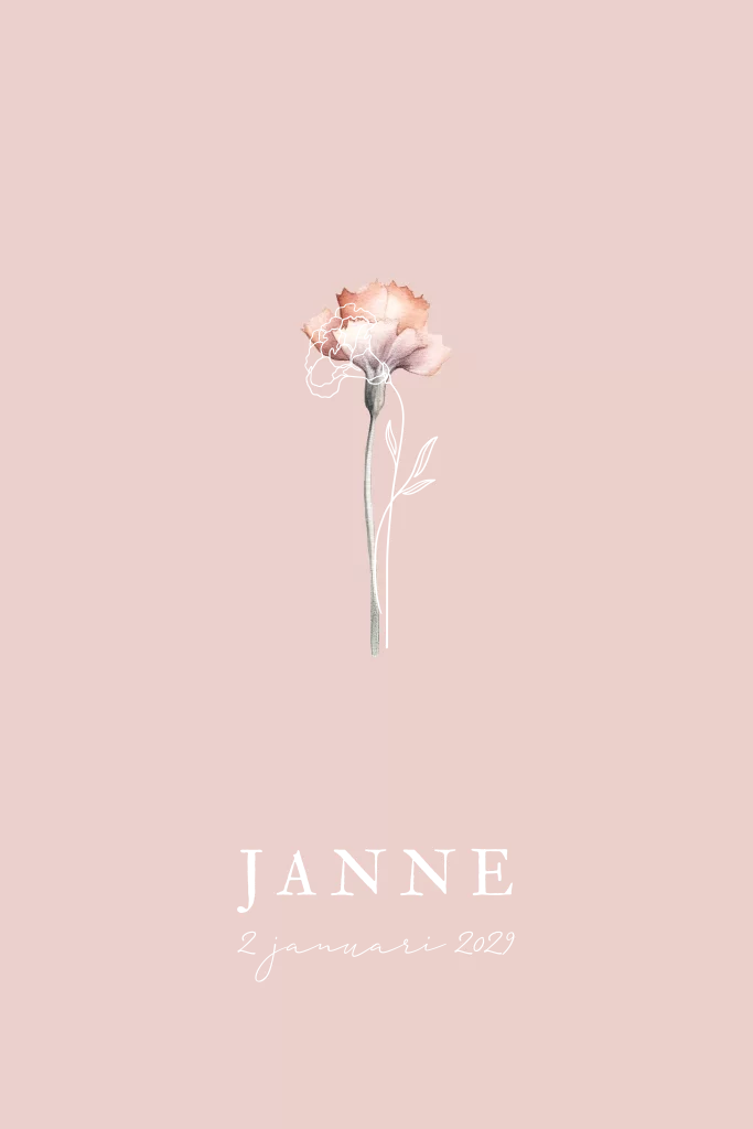 Geboortekaartje met een aquarel geboortebloem - maand januari, de anjer en een lijntekening van een anjer eroverheen in koperfolie. Hulp of advies nodig? Wij helpen je graag!