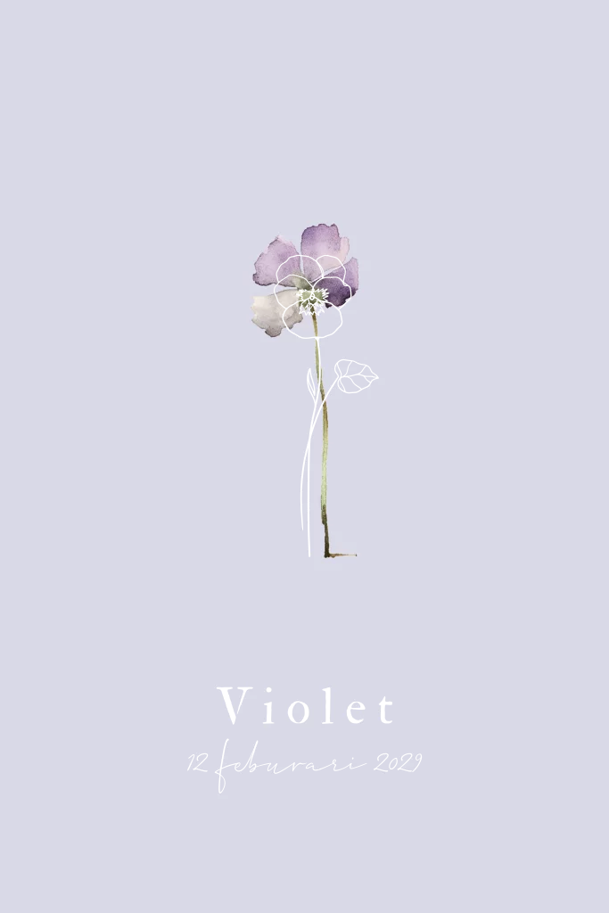 Geboortekaartje met een aquarel geboortebloem - maand februari, het viooltje en een lijntekening van een viooltje eroverheen in goudfolie. Hulp of advies nodig? Wij helpen je graag!