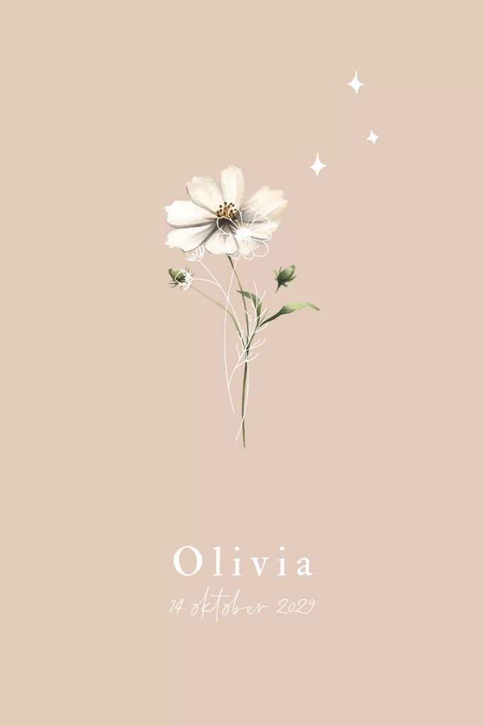 Geboortekaartje met een aquarel geboortebloem - maand oktober, de cosmea en een lijntekening van een cosmea eroverheen in goudfolie. Hulp of advies nodig? Wij helpen je graag!