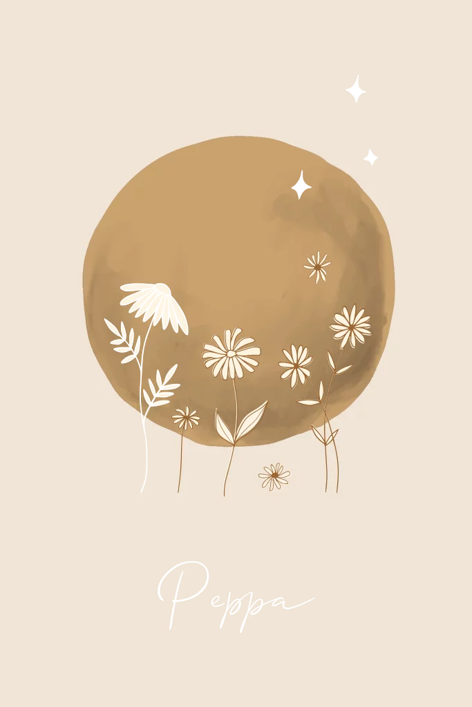 Geboortekaartje met getekende bloemetjes in volle maan