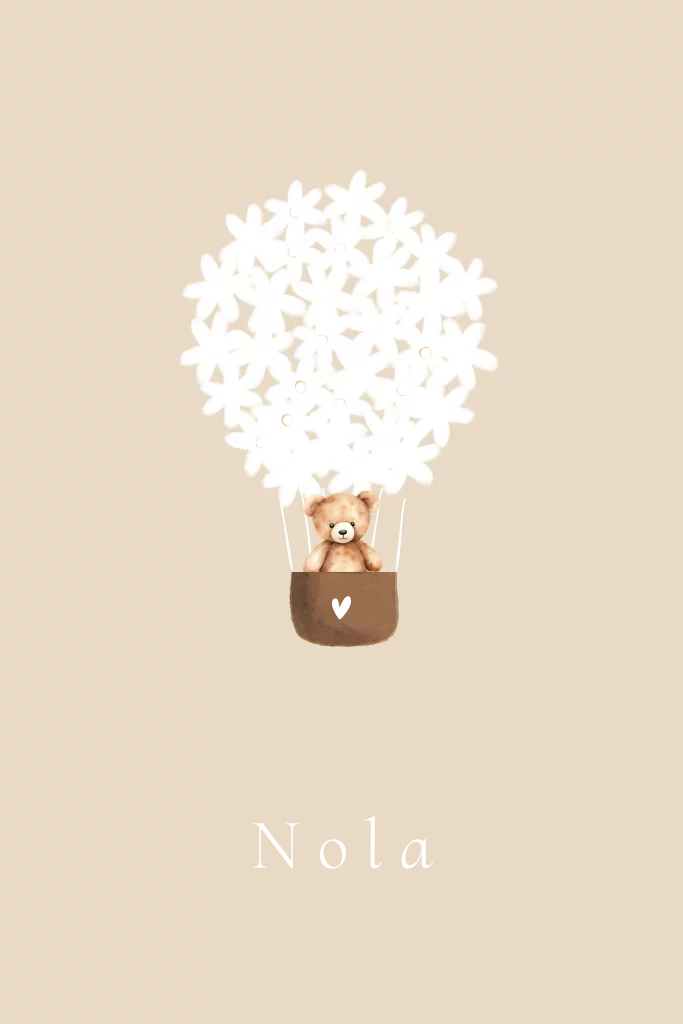 Geboortekaartje met madeliefjes luchtballon en een knuffelbeertje in aquarel getekend. De knopjes van de madelief bloemetjes worden gedrukt in goudfolie.