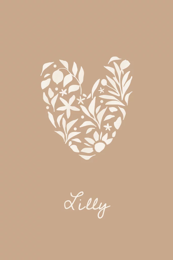 Een mooi lief geboortekaartje voor een meisje. Het bloemenhart en babynaam worden gedrukt in hoogglans in zandkleuren en beige.