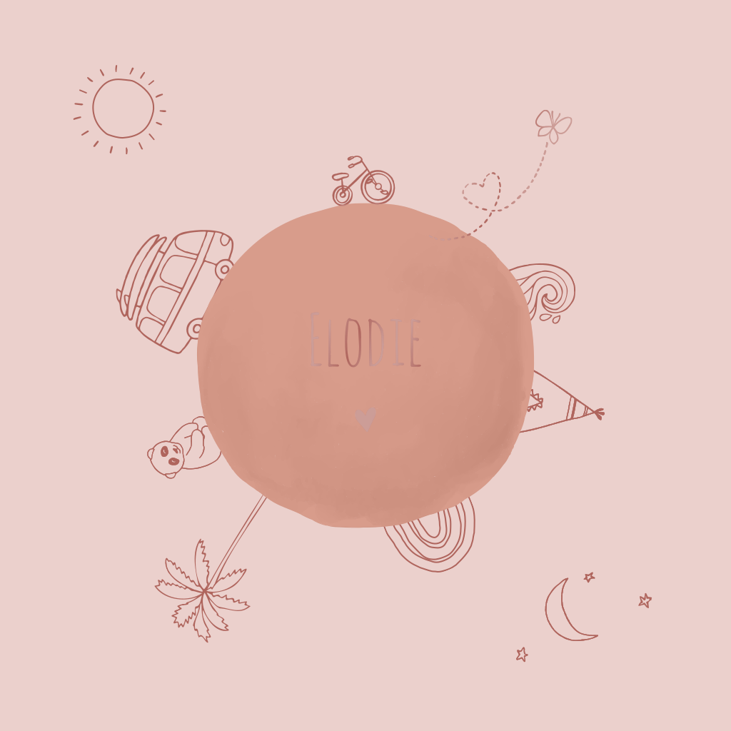 Geboortekaartje meisje met handgetekende items rondom wereldbol
