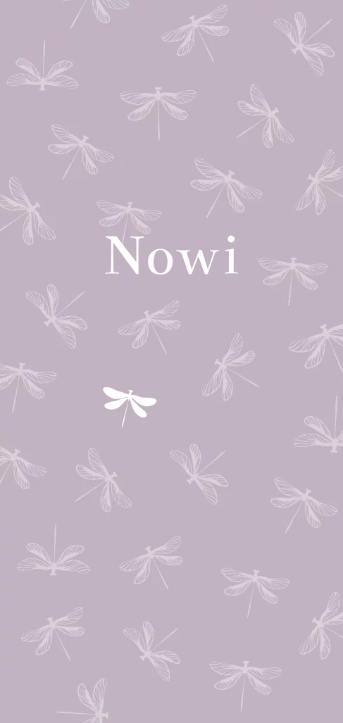 Lief lang geboortekaartje met een libelle patroon in lila. Één libelle en de babynaam worden gedrukt in goudfolie.