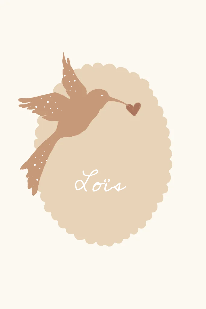 Stoer en lief geboortekaartje met een vogel en een hartje in zijn bek, de naam in goudfolie. Pas gemakkelijk de kleuren en/of folie aan, net zoals al jouw gegevens op dit kaartje. Wil je deze kaart in een ander formaat/vorm of dubbele kaart? Stuur ons een berichtje en wij helpen je graag verder!