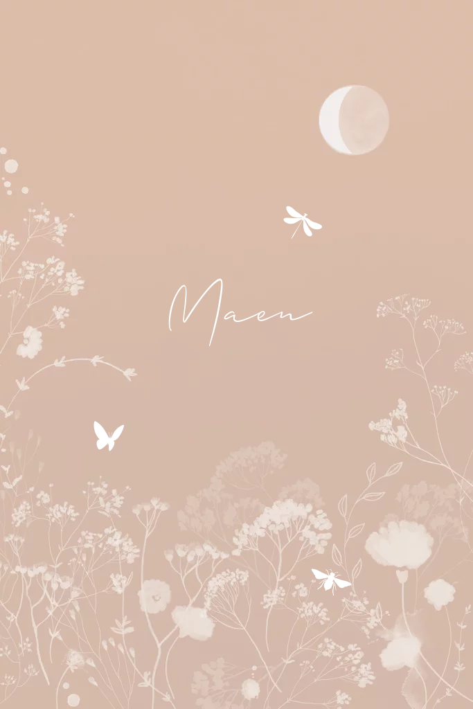 Geboortekaartje met prachtige bloemenweide libelle vlinder bijtje en maan.