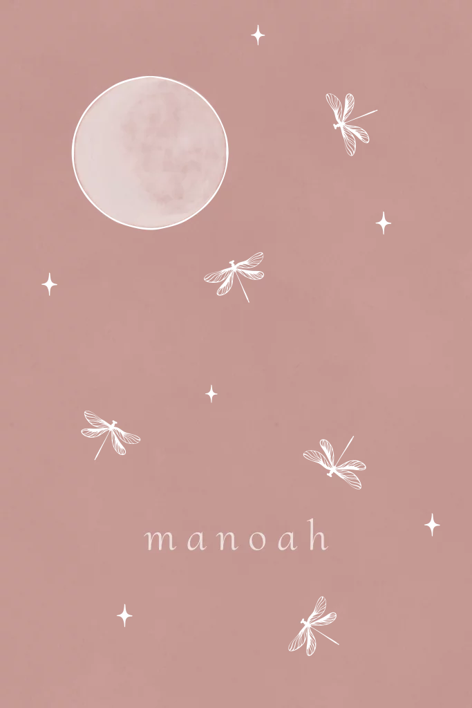 Een lief geboortekaartje met mooie rode maan, sterren en libelles die rond de maan vliegen. De libelles en sterren worden gedrukt in goudfolie. Je kunt altijd de kleuren aanpassen in de handige editor.