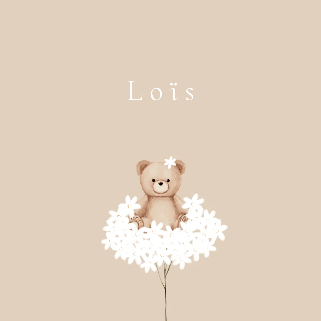 Lief geboortekaartje met teddybeer/knuffelbeertje (zie in de editor voor verschillende knuffelbeertjes) in een madelief bloem met goudfolie knopjes. Pas de achtergrond kleuren gemakkelijk aan, net zoals je eigen gegevens en naam van je baby. Hulp nodig of wil je deze kaart in een ander formaat? Stuur een berichtje, wij helpen je graag!