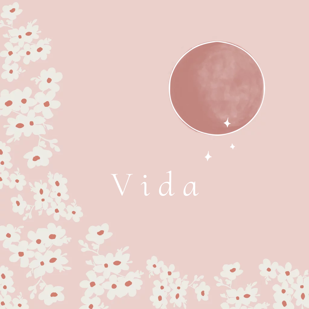 Een lief geboortekaartje voor een meisje met mooie bloemetjes, grote volle maan in oranjerood en sterren. De sterren en babynaam worden in een rosegoudfolie gedrukt.