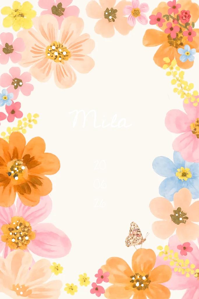 Prachtig kleurrijk handgetekende bloemen geboortekaartje voor een meisje. Pas gemakkelijk gegevens en/of achtergrond aan in de online editor. Heb je hulp nodig of wil je dit geboortekaartje in een andere vorm of dubbele kaart? Stuur ons een berichtje en wij helpen je graag verder.