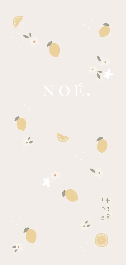 Langwerpig geboortekaartje met citroentjes en madeliefjes stipjes en goudfolie