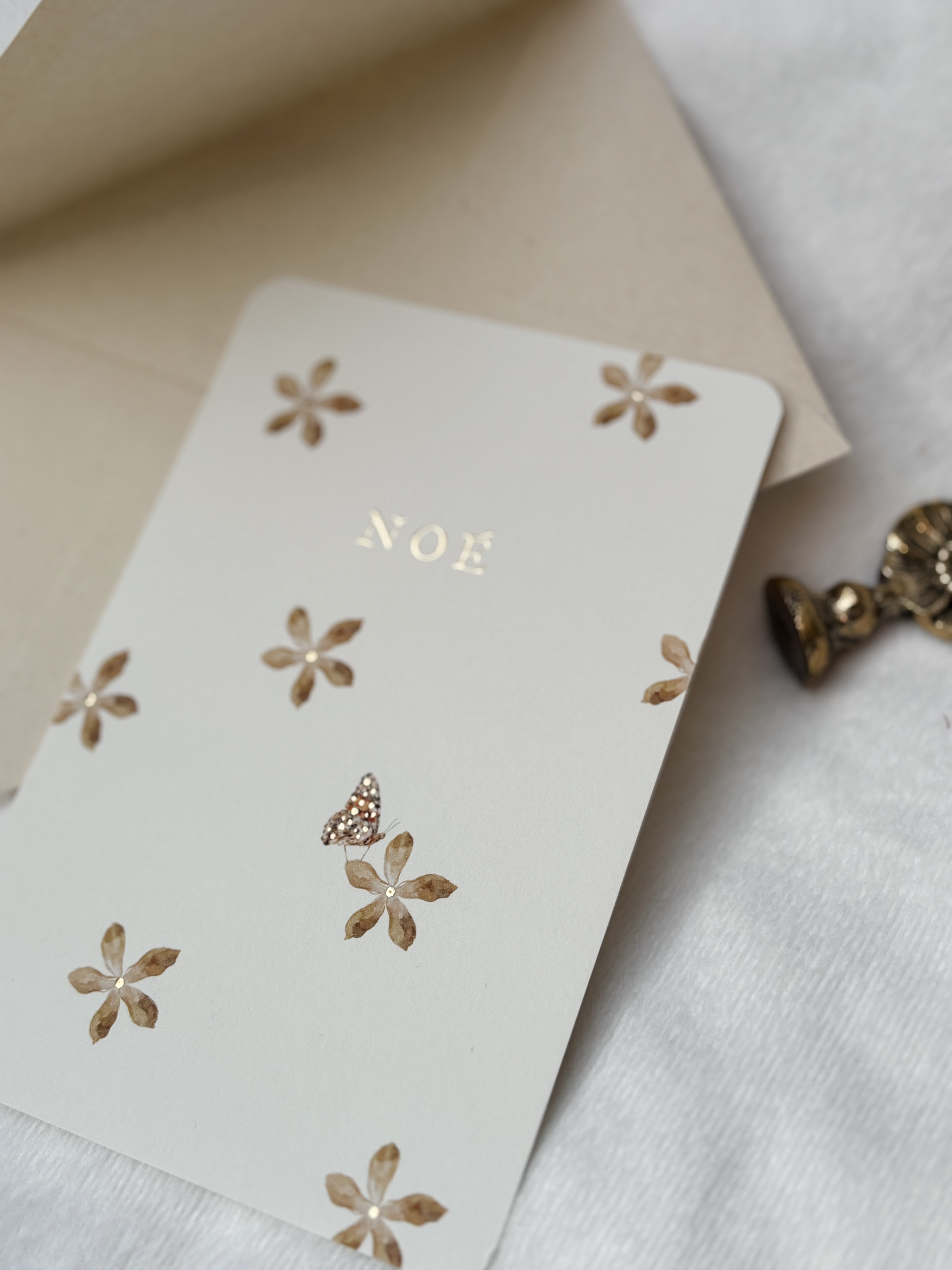 Een lief lente/zomer geboortekaartje met mooie aqaurel beige bloemetjes en vlinder, afgewerkt met goudfolie knopjes en goudffoliestipjes op de vleugels van de vlinder.