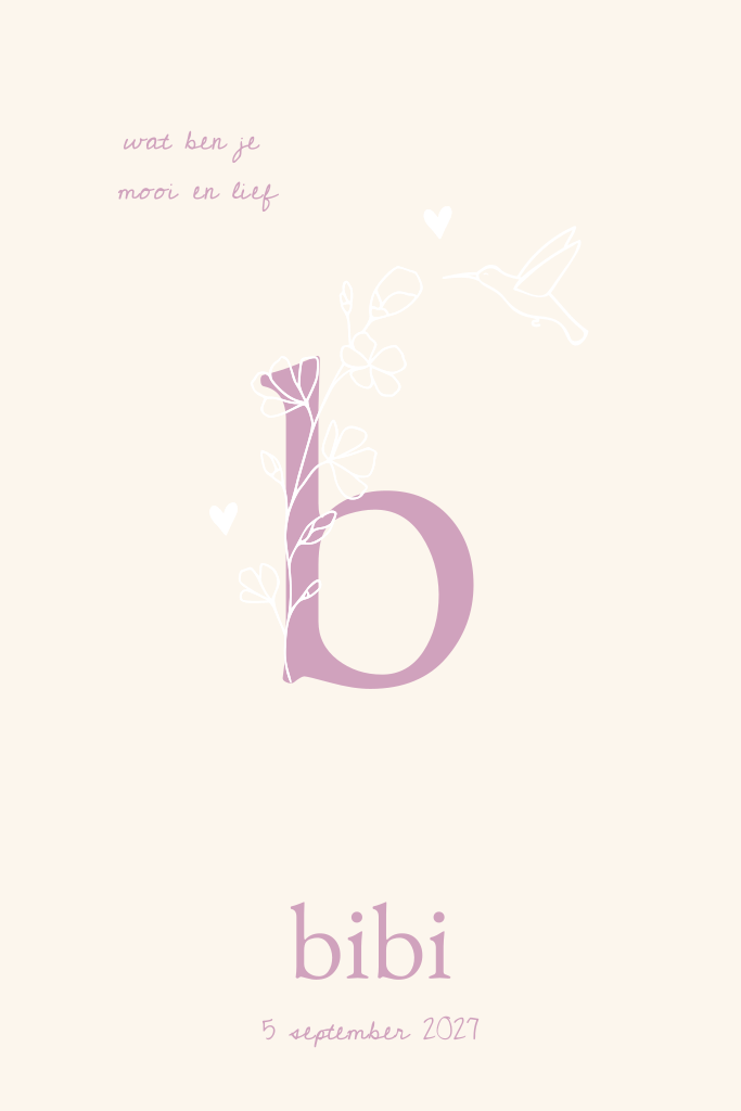 Lettergeboortekaartje meisje minimalistisch met bloem en kolibri