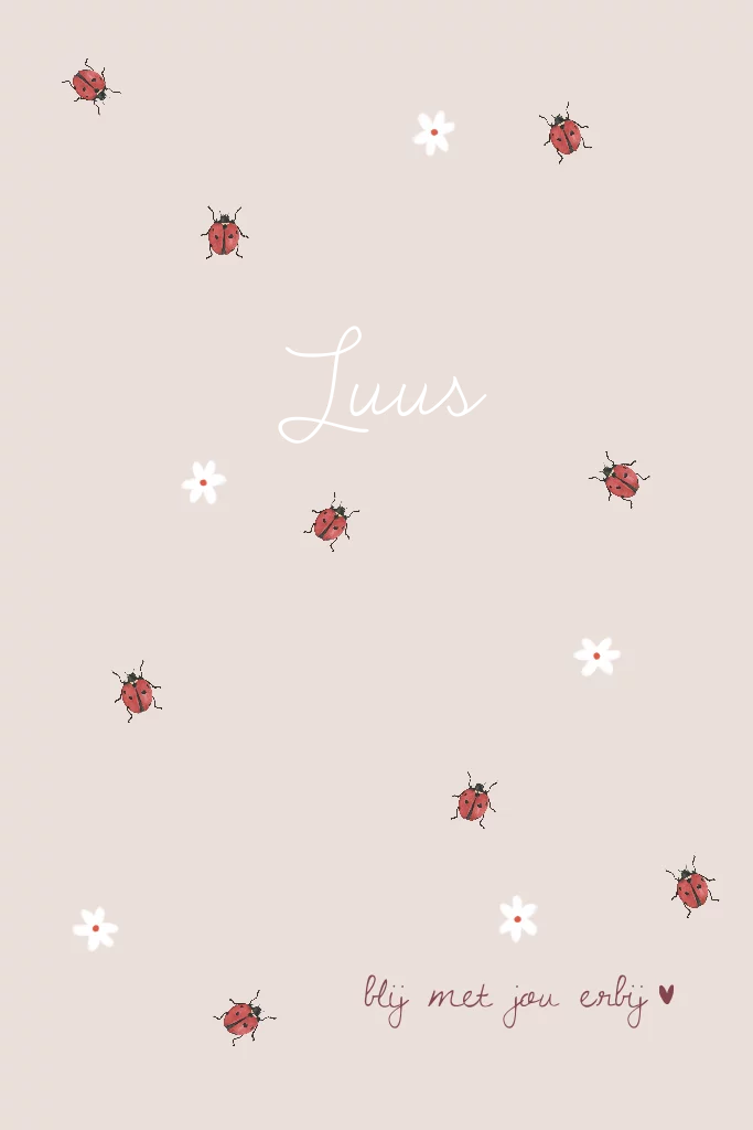 Lief geboortekaartje aquarel lieveheersbeestjes en madeliefjes. De naam staat nu in rosegoudfolie, maar deze kun je gemakkelijk wijzigen in een andere folie of andere kleur. Hulp nodig? Stuur ons gerust een berichtje als je er niet uitkomt en/of je bijvoorbeeld een andere vorm kaart of dubbele kaart wilt. Wij helpen je graag!