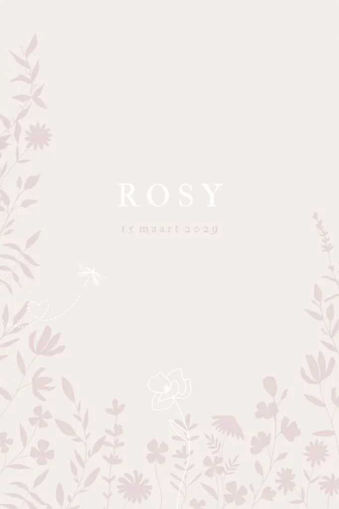 Lief bloemen geboortekaartje in roze en libelle getekend in goudfolie
