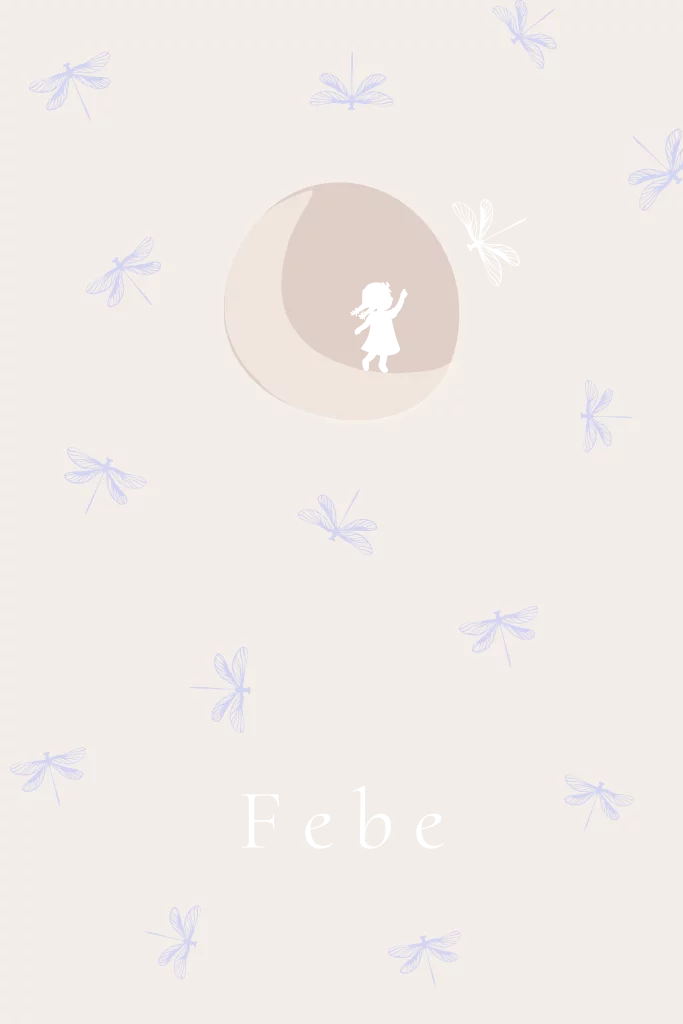 Een lief geboortekaartje met een meisje wat op de maan staat, libelles die rond de maan vliegen en subtiele sterren (stipjes). De babynaam, sterren en 1 libelle worden gedrukt in goudfolie. Je kunt altijd de kleuren aanpassen in de handige editor. Heb je vragen of wil je de kaart in een ander formaat? Stuur gerust een berichtje, ik help je graag!