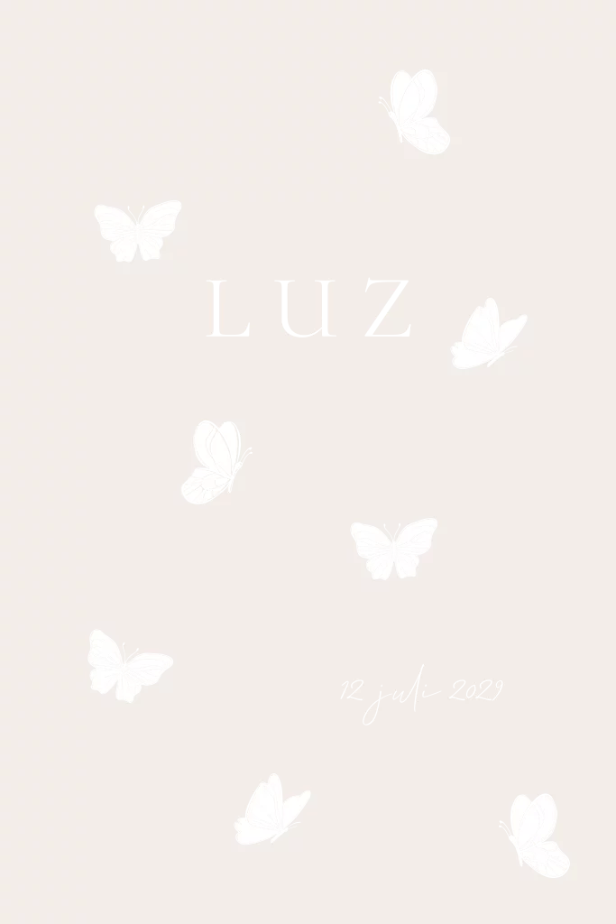 Staand geboortekaartje met ronde hoeken. De vlinders, babynaam en subtiele stipjes worden gedrukt met goudfolie.