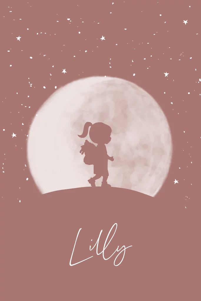 Mooi geboortekaartje met oudroze achtergrond en een silhouette van een meisje wat de wereld inloopt met een mooie volle maan op de achtergrond. Pas zelf gemakkelijk de kleuren van de achtergrond aan. Hulp nodig? Wij helpen je graag!