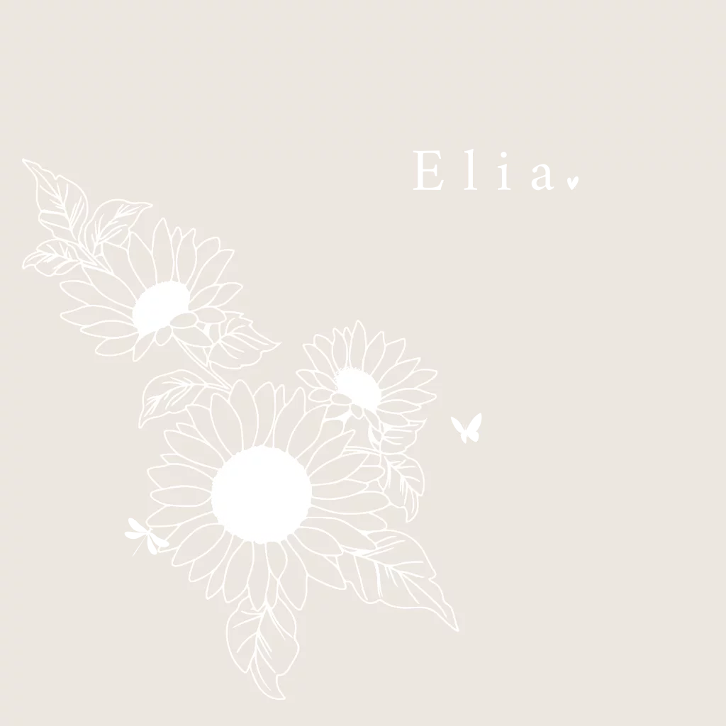 Lief bloem geboortekaartje met zonnebloemen, libelle en vlinder in goudfolie. De stipjes van de zonnebloemen, de libelle, de vlinder en babynaam worden gedrukt in goudfolie. Pas het allemaal gemakkelijk zelf aan in de editor!