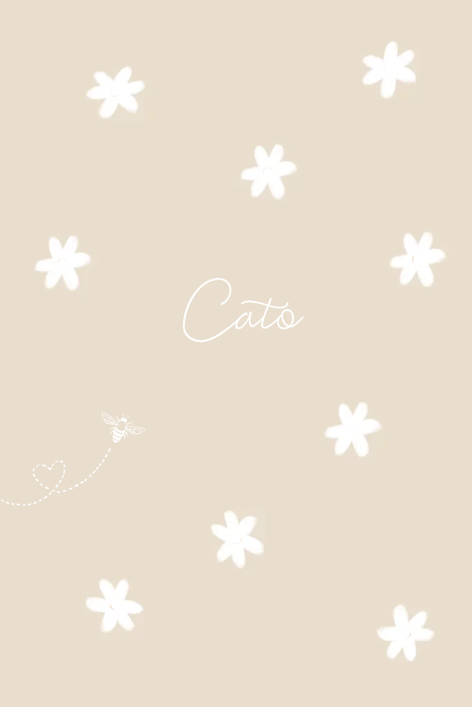 Lief madeliefjes bloemen bijtje geboortekaartje in lila en goudfolie.