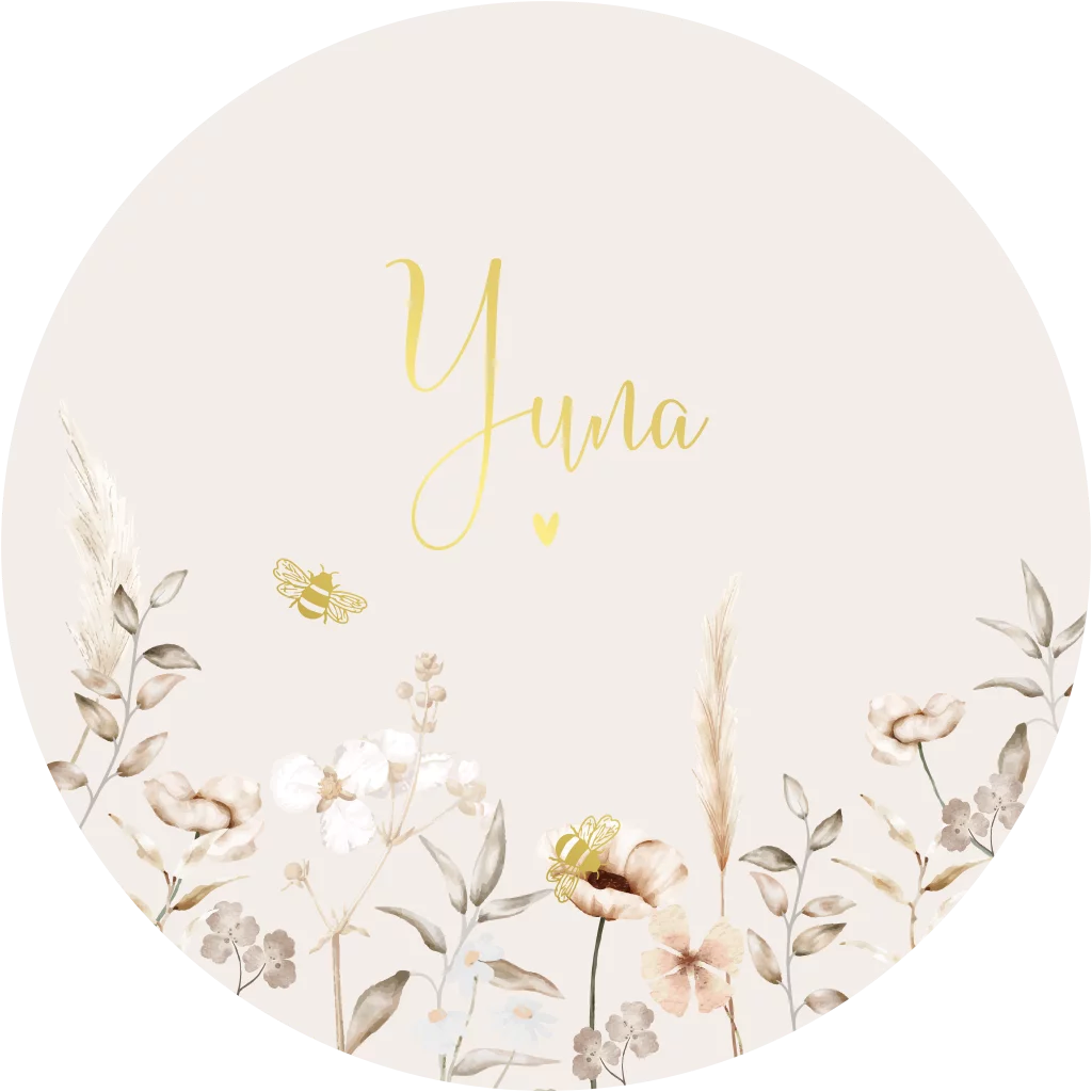 Rond lief geboortekaartje met wilde veldbloemen in kleuren roze en beige en twee bijtjes in goudfolie