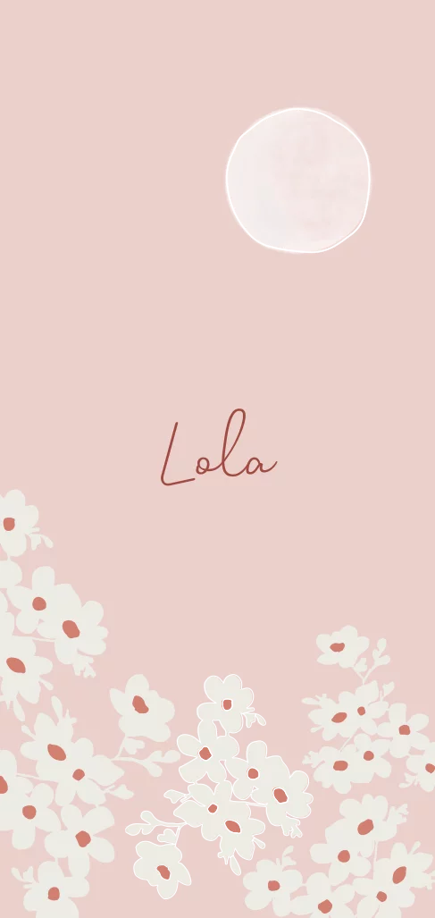 Een lief geboortekaartje met mooie bloemen en een volle grote maan. Het lijntje om de maan, belijning om een paar bloemen en babynaam worden gedrukt in rosegoudfolie, wat een super speciaal effect geeft.