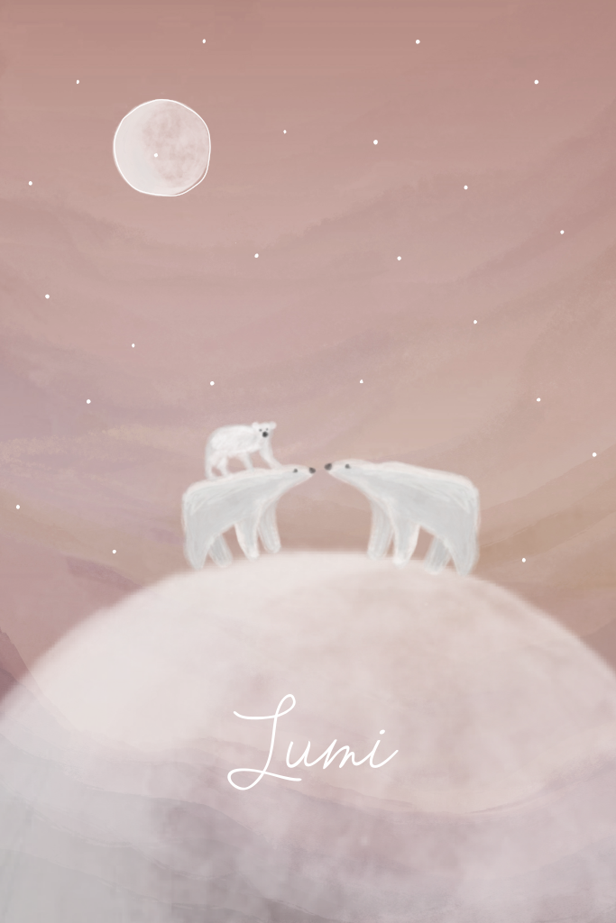 Winters geboortekaartje met ijsberen familie in de sneeuw. De omlijning van de maan, de subtiele stipjes (sterren) en de babynaam worden gedrukt in goudfolie. Personaliseer het kaartje zelf naar smaak met de handige editor en pas bijvoorbeeld de kleuren en/of folie aan.