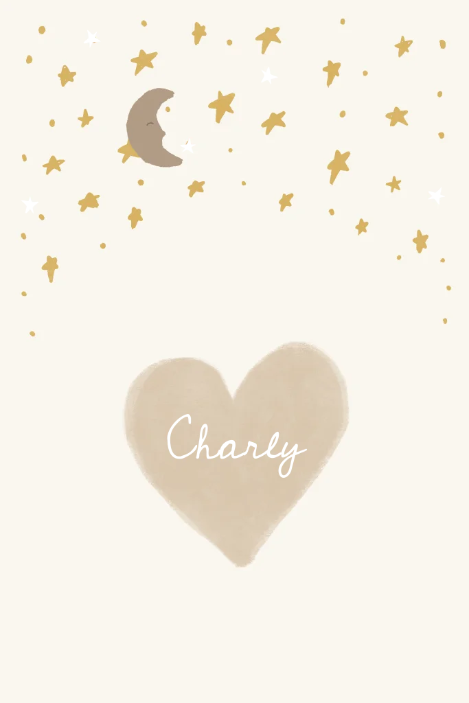 Gaaf geboortekaartje in een bohemian eclectic stijl met een mooie beige taupe sterrenhemel in boog met een hart. Pas gemakkelijk de kleuren aan. Wil je deze kaart liever in een andere vorm of dubbele kaart - stuur ons een berichtje en wij zetten het gratis voor je om.