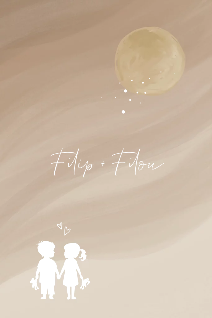 Lief geboortekaartje met een tweeling silhouet en maan in zandkleur achtergrond en sterretjes en silhouettes in goudfolie. Andere samenstelling tweeling? Wij passen het gratis voor je aan, stuur ons gewoon een berichtje!