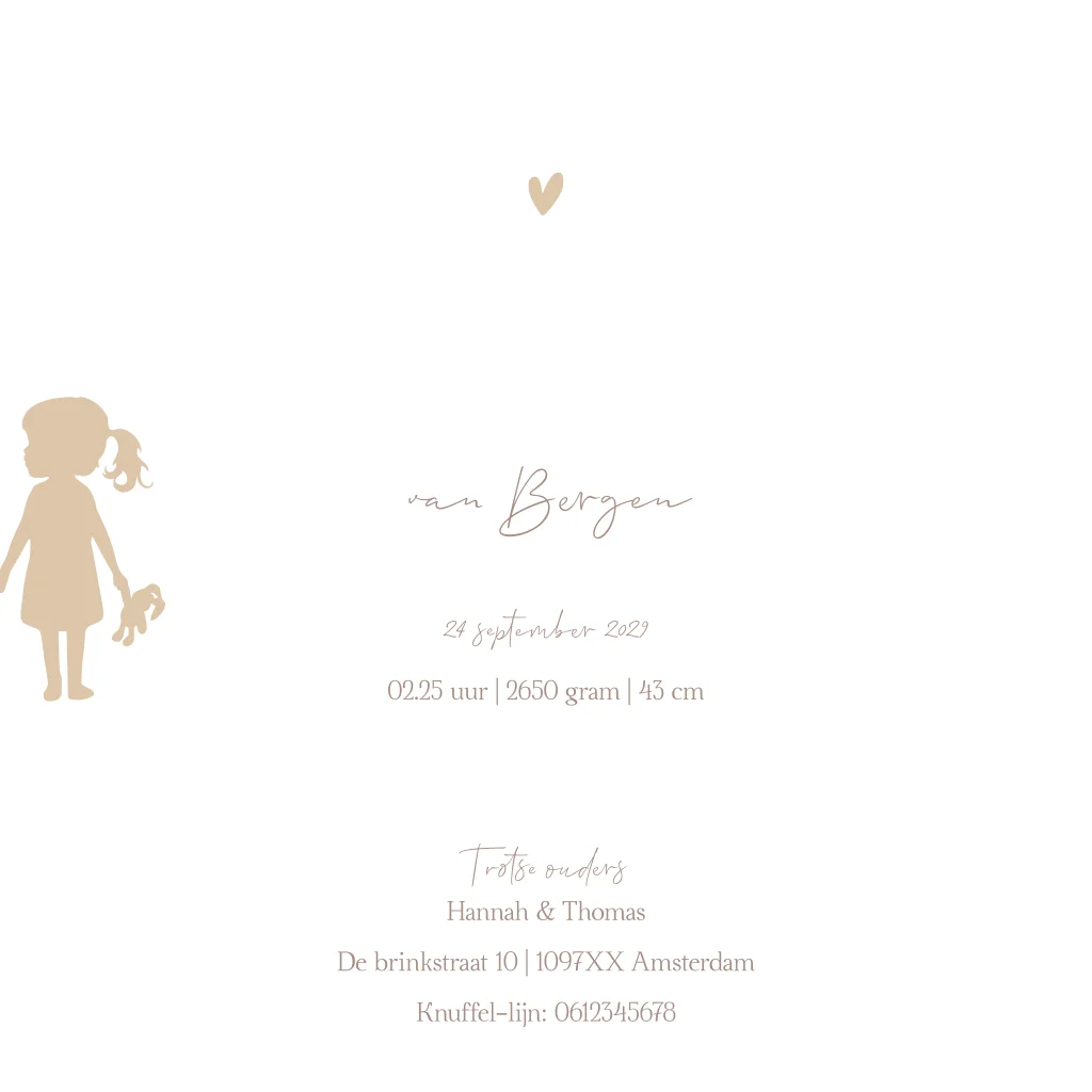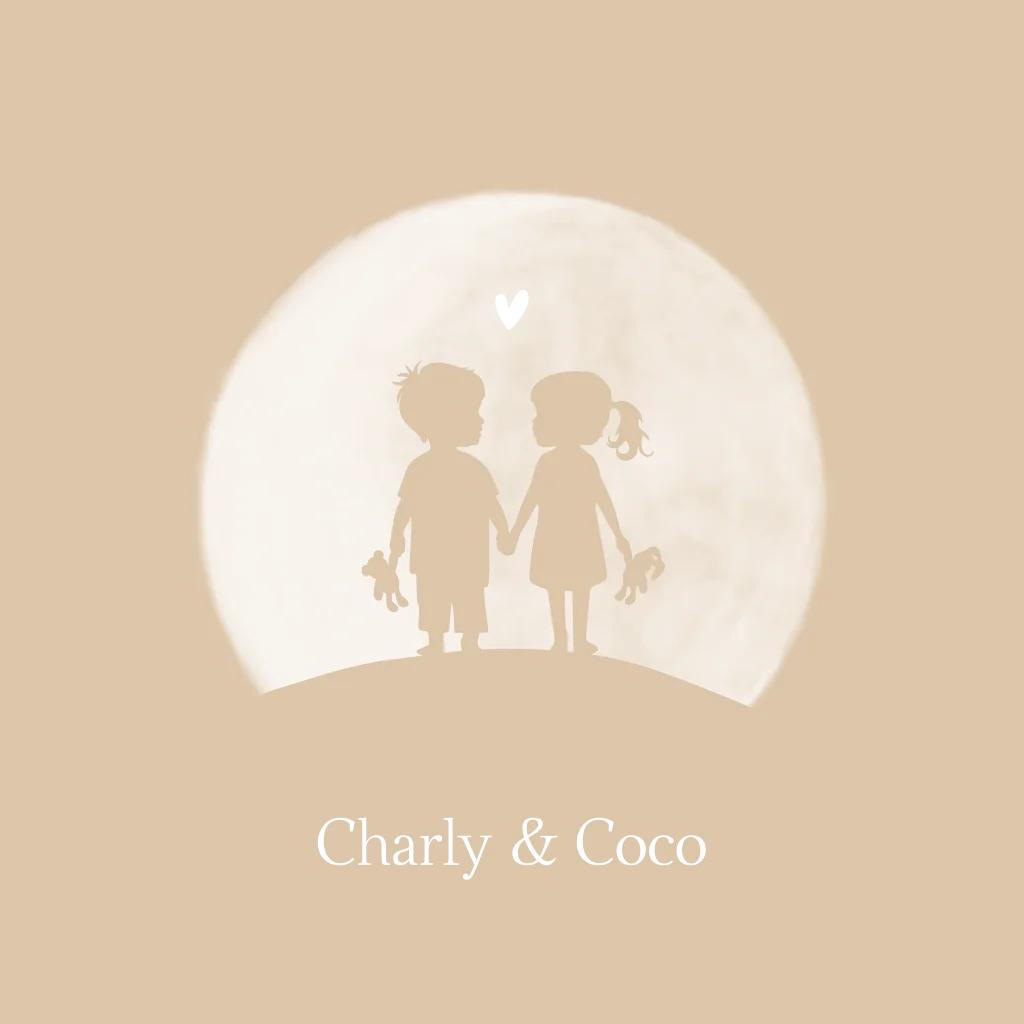 Lief geboortekaartje voor een tweeling die als silhouette getekend zijn voor een volle mooi maan. De kleuren kun je naar eigen wens en smaak aanpassen. En voor hulp staan wij altijd voor je klaar!