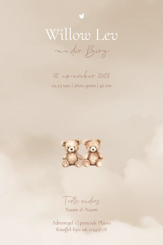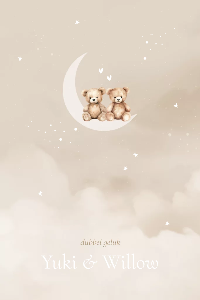 Prachtig tweeling geboortekaartje knuffelbeertjes maan wolken folie