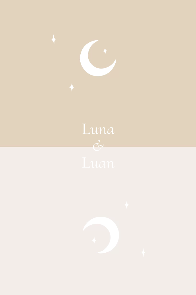 Een geboortekaartje voor een tweeling met spiegeling van de maan. De manen en sterren worden in koperfolie gedrukt.