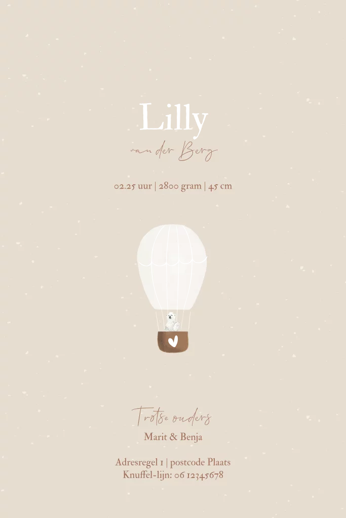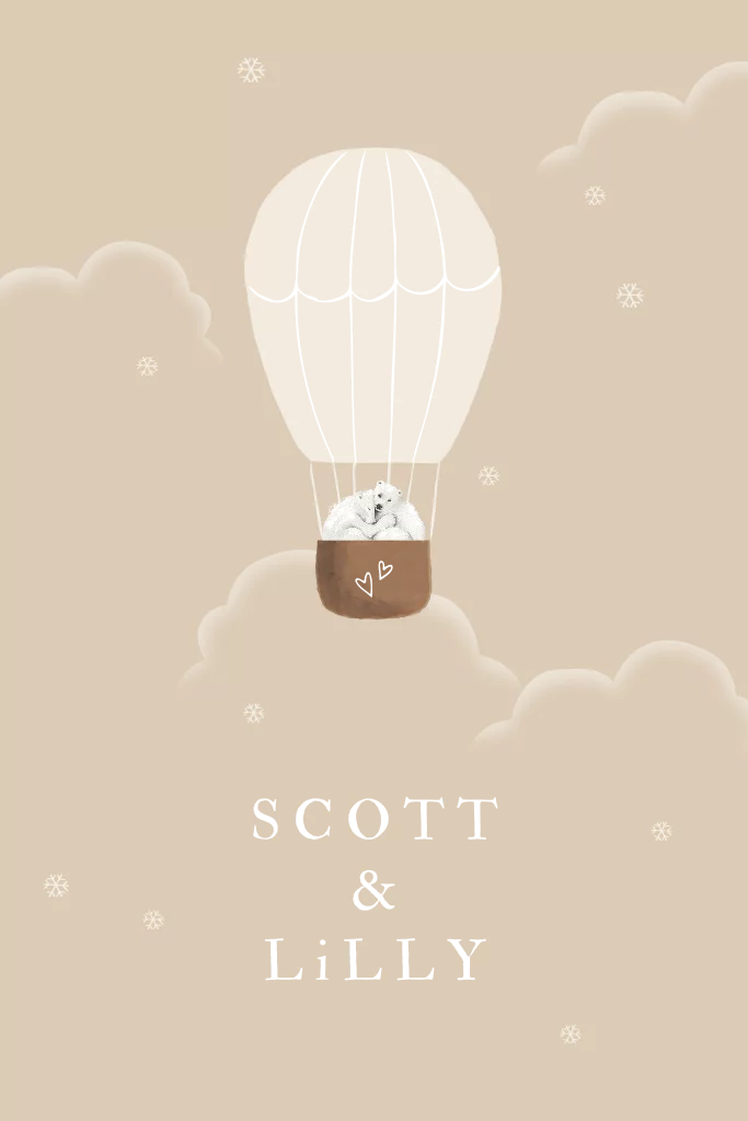 Superlief winters geboortekaartje voor een tweeling met twee ijsbeertjes knuffelend in een luchtballon zwevend in de wolken door de sneeuw. De lijnen van de luchtballon worden gedrukt in goudfolie, voor een wouw effect. Pas gemakkelijk de kleuren en/of folie aan. Heb je hulp nodig bij het opmaken van je kaartje? Wij helpen je graag!